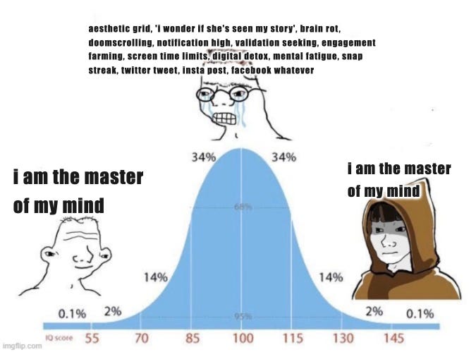 Regardless of how carefully you craft your feed, the side of the internet that is meant for mind-numbing content will find you. You will engage with it, forgetting this is not what you signed up for. People smarter than you are on the other side working against you, making sure you're on the apps longer, engaging with content you don't want to, and buying things you don't need.